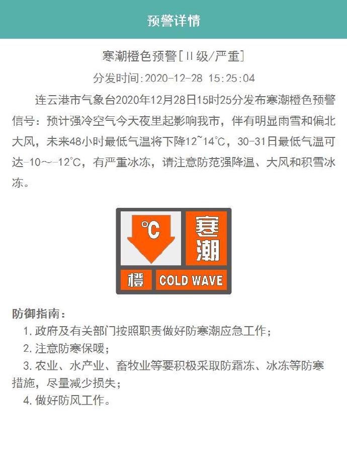連雲港市氣象台2020年12月28日15時25分發布寒潮橙色預警信號:預計強冷空氣今天夜裏起影響我市,伴有明顯雨雪和偏北大風,未來48小時最低氣温將下降12~14℃,30—31日最低氣温可達-10~-12℃,有嚴重冰凍,請注意防範強降温、大風和積雪冰凍。