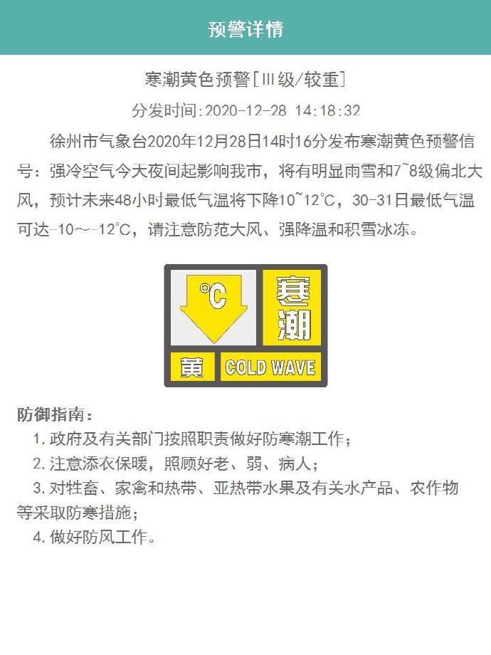 徐州市氣象台2020年12月28日14時16分發布寒潮黃色預警信號:強冷空氣今天夜間起影響徐州市,將有明顯雨雪和7~8級偏北大風,預計未來48小時最低氣温將下降10~12℃,30—31日最低氣温可達-10~-12℃,請注意防範大風、強降温和積雪冰凍。