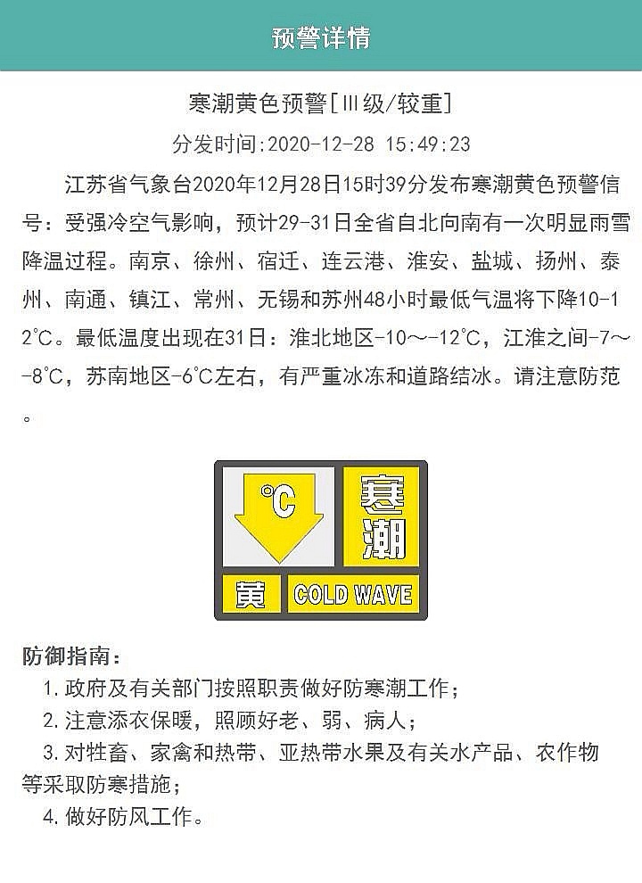 江蘇省氣象台2020年12月28日15時39分發布寒潮黃色預警信號:受強冷空氣影響,預計29—31日全省自北向南有一次明顯雨雪降温過程。南京、徐州、宿遷、連雲港、淮安、鹽城、揚州、泰州、南通、鎮江、常州、無錫和蘇州48小時最低氣温將下降10~12℃。最低温度出現在31日:淮北地區-10~-12℃,江淮之間-7~-8℃,蘇南地區-6℃左右,有嚴重冰凍和道路結冰。請注意防範。