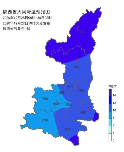 此外,據陝西省氣象台通報,預計28日08時至30日08時,過程日平均氣温陝北下降12~14℃,關中西部、陝南西部下降8~10℃,關中東部、陝南東部下降10~12℃;最低氣温陝北、關中大部、漢中出現在30日清晨,最低氣温:榆林、延安北部-22~-20℃。
