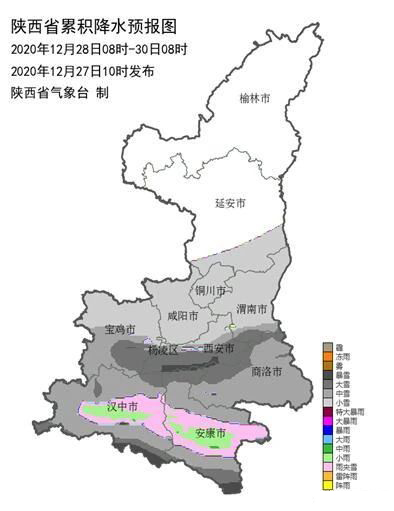 主要降水時段在28日中午至29日下午,陝北南部部分、關中北部有小雪,關中南部、陝南小到中雨轉雨夾雪或中雪,秦巴山區部分地方有大雪、局地暴雪。預計積雪深度:陝北南部、關中北部1~3釐米;關中南部2~5釐米;秦巴山區3~8釐米。