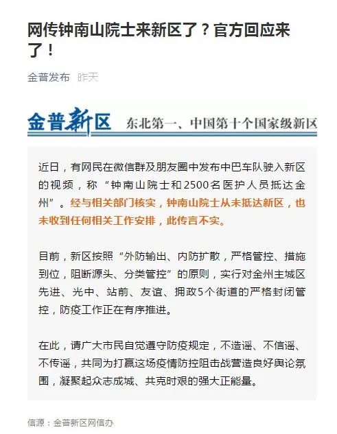 12月27日,據大連市金普新區網信辦消息,經與相關部門核實,鍾南山院士從未抵達新區,也未收到任何相關工作安排,此傳言不實。