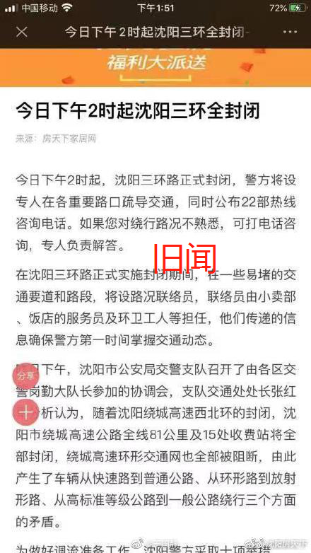 據瀋陽網警巡查執法官方微博12月28日消息,網傳“今日下午2時起瀋陽三環全封閉”新聞截圖是2012年的舊新聞。目前瀋陽交通情況一切正常!