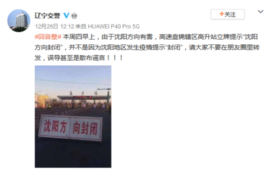 26日,遼寧交警發佈微博,稱由於瀋陽方向有霧,高速盤錦轄區高升站立牌提示“瀋陽方向封閉”,並不是因為瀋陽地區發生疫情提示“封閉”。