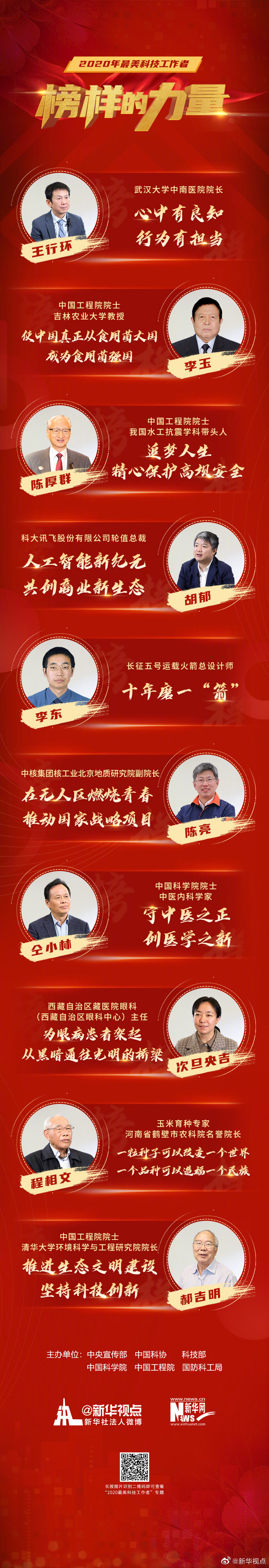 王行環、李玉、陳厚羣、胡鬱、李東、陳亮、仝小林、次旦央吉、程相文、郝吉明等10人,都是來自科研生產一線的科技工作者先進典型。他們中有的積極投身抗擊新冠肺炎疫情一線,捨生忘死築起阻擊病毒的鋼鐵長城;有的紮根脱貧攻堅一線,將論文寫在祖國大地上;有的矢志不移自主創新,將核心技術牢牢掌握在自己手裏;有的積極促進科技經濟緊密結合,用科技服務民生……他們是中國科技工作者的優秀代表,他們以實現國家富強、民族振興、人民幸福為己任,用責任、毅力與擔當,書寫着一個又一個創新奉獻的故事,他們以實際行動,生動詮釋了中華民族偉大精神的真諦,有力弘揚了新時代科學家精神,展現了中國科技工作者的良好精神風貌。