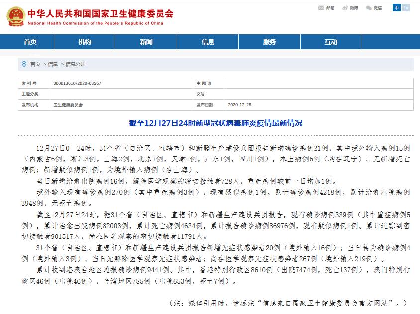 12月27日0—24時,31個省(自治區、直轄市)和新疆生產建設兵團報告新增確診病例21例,其中境外輸入病例15例(內蒙古6例,浙江3例,上海2例,北京1例,天津1例,廣東1例,四川1例),本土病例6例(均在遼寧);無新增死亡病例;新增疑似病例1例,為境外輸入病例(在上海)。