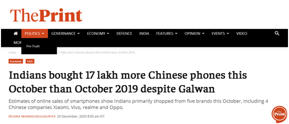 “這些數據意味着,雖然印度官方今年禁止了約200箇中國手機應用程序,並且在邊境上與中國有衝突,但印度國內手機市場對抵制中國產品的響應並不大。”《聯合早報》説。