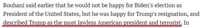 伊朗總統魯哈尼近期的電視講話中將特朗普稱為“最無法無天的美國總統”和“恐怖分子”,堅信“伊朗長達三年的抵抗將迫使未來的美國政府屈服於人民,重新履行承諾,打破制裁”。