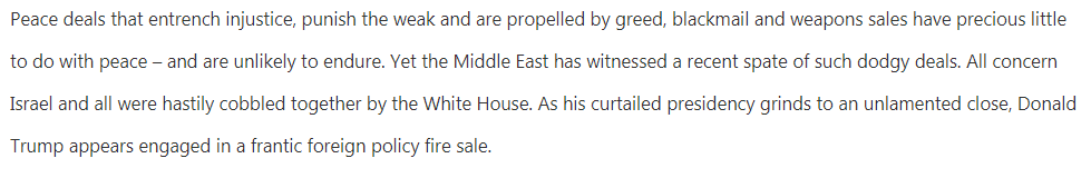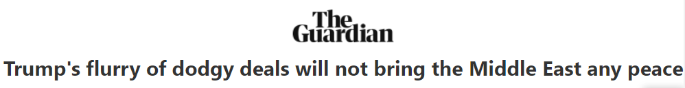 回顧美國一年來在中東的種種表現,英國《衞報》一篇題為*《特朗普的一系列狡詐危險的協議不會給中東帶來任何和平》* 的文章或許可做註腳:“那些由貪婪、敲詐和武器銷售推動的和平協議都是白宮倉促拼湊而成的,與和平幾乎毫無關係,而且不太可能持久。特朗普似乎正在進行一場瘋狂的外交政策大甩賣,而他被縮減的總統任期即將以無人惋惜的方式結束 。”