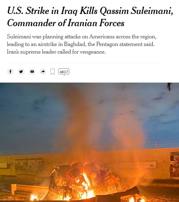△《紐約時報》:美國在伊拉克襲殺伊朗將軍蘇萊馬尼。