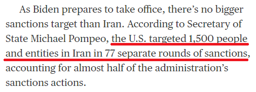 在特朗普政府任內,美國對伊朗的全方位打壓呈逐年升級之勢。據統計,過去四年,美國已經對伊朗實施了77輪、針對超過1500個實體或個人的制裁措施。