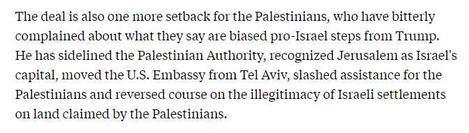 特朗普政府甚至在輸掉大選後仍然宣稱,對於擴大以色列與穆斯林世界的關係來説“每一天都很重要”,暗示在任期結束之前會有更多動作。《耶路撒冷郵報》評論稱,在中東建立反伊朗的新同盟方面,“這顯然是一個不眠不休的政府” 。