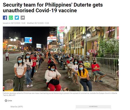 總統安全護衞隊接種疫苗之際,報道稱,目前還沒有一種新冠疫苗獲得菲律賓食品和藥物管理局的批准。而菲律賓正在與幾家疫苗研發機構進行談判,包括英國阿斯利康公司、美國輝瑞公司以及中國國藥集團,以確保該國最早於2021年第二季度開始規模達6000萬劑的新冠疫苗接種工作。
