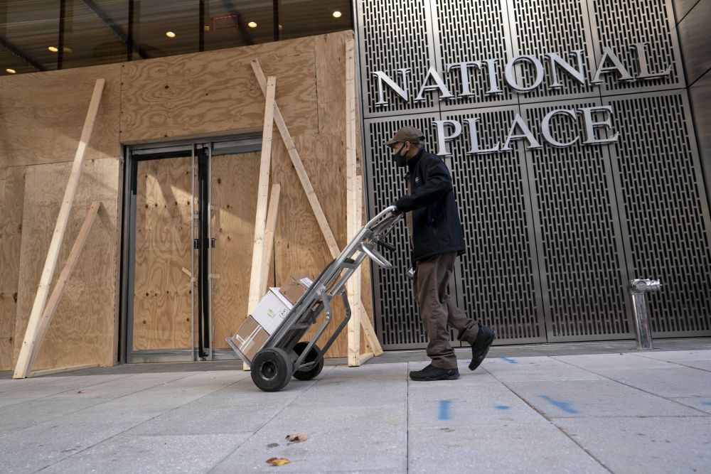 11月19日,美國華盛頓的一名快遞員經過一處用木板加固門窗的辦公樓。(新華社記者劉傑攝)