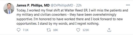 據CNN 報道,菲利普斯在27日完成了他在沃爾特·裏德醫療中心最後一天的工作,併發推文説他“會想念這些病人們”,同時感謝了醫院工作人員們的支持。