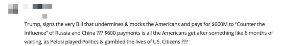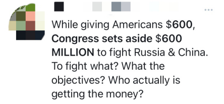 有網友批評説,這份法案中給美國人的直接救濟金只有600美元,但國會卻撥出6億去對抗中俄。↓