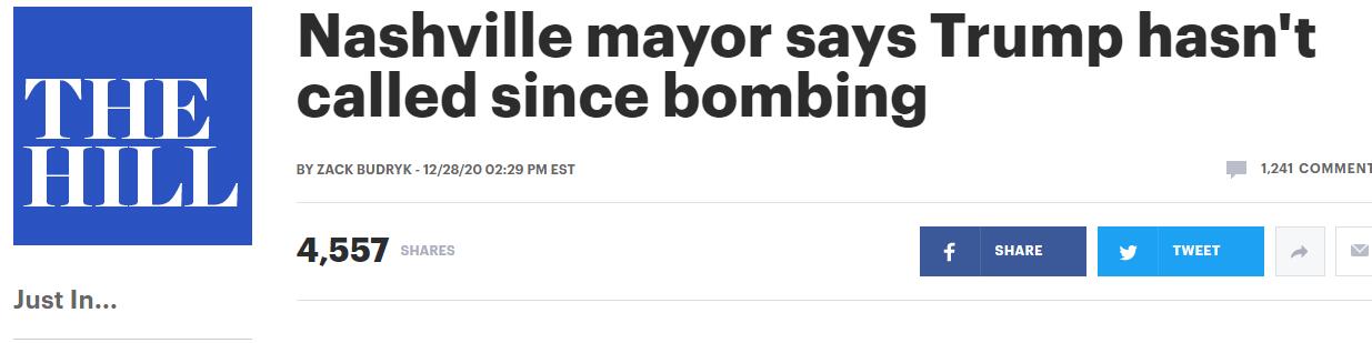 【環球網報道 記者 侯佳欣】距離聖誕節當日的爆炸事件已經過去了3天,據美國《國會山報》報道,當地時間12月28日,田納西州納什維爾市長約翰·庫珀接受採訪時表示,自爆炸案發生以來,他還沒有接到來自總統特朗普的電話。