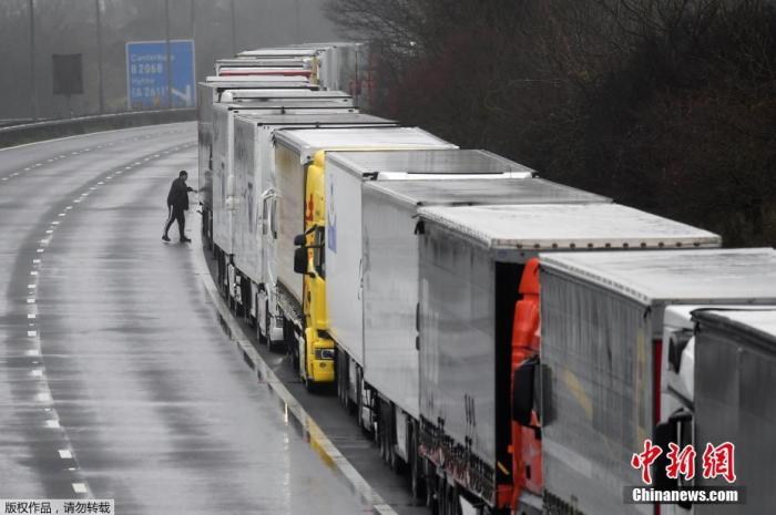當地時間12月21日,歐盟多國對英實施交通封鎖,英國無法出境的長途卡車排起長隊。