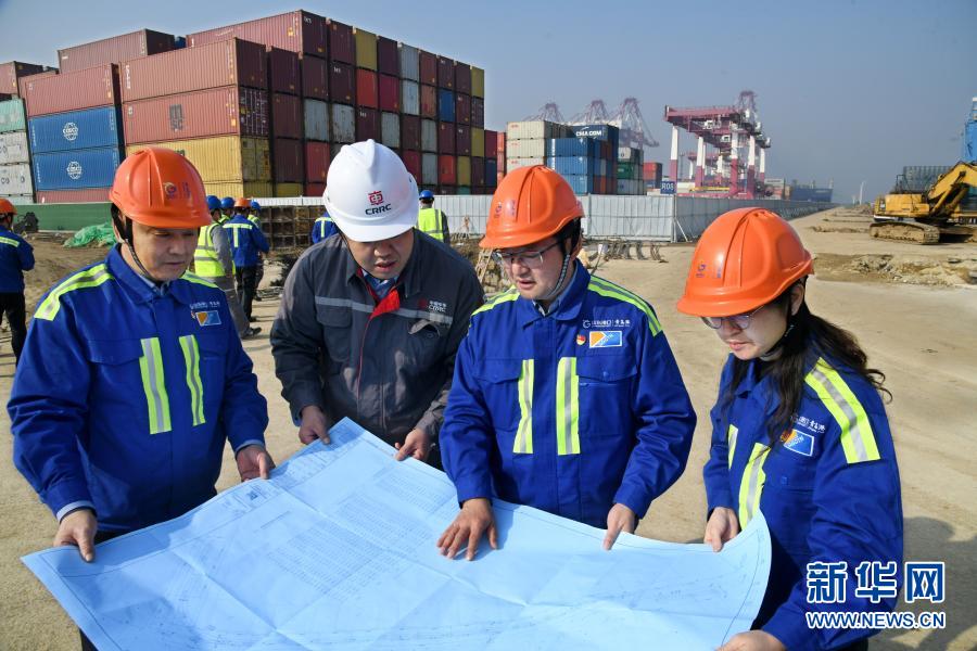 12月27日,“連鋼創新團隊”成員在山東港口青島港全球首創的集裝箱智能空軌集疏運系統建設工地上,與施工方研究優化施工方案。新華社記者 李紫恆 攝