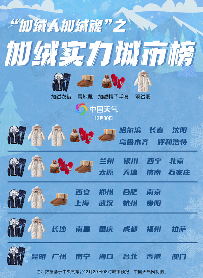 長沙、南昌、重慶、成都、福州、拉薩,全天氣温僅10℃出頭,甚至不足10℃,像重慶和成都沒有陽光加持,陰冷感覺還會更加明顯——加絨衣褲和羽絨服,兩層絨加身,出門無懼寒潮!