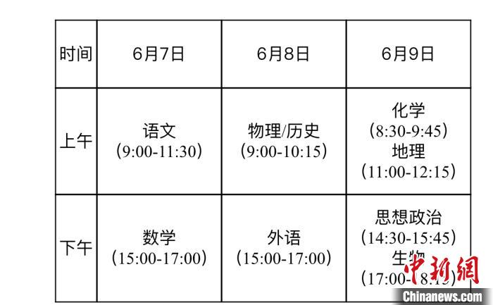 考試時間安排在6月7日至9日,共3天。語文科目考試時長為150分鐘,數學、外語科目考試時長均為120分鐘,學業水平選擇性考試科目每科考試時長均為75分鐘。具體考試安排為: