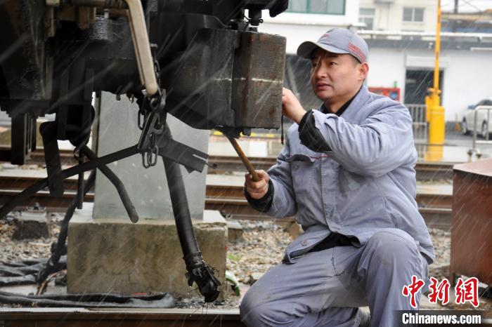 中國鐵路上海局集團公司合肥車輛段員工在對列車進行檢查。 何昭君 攝