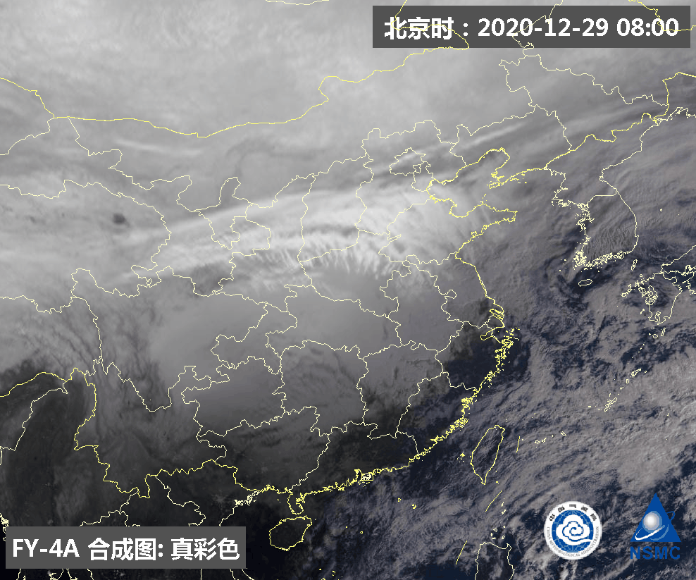 12月29日風雲四號A星監測合成真彩色動態圖顯示,我國黃淮、江淮、江漢、江南、西南地區東部以及華南西北部有較密實的雲系覆蓋。圖/國家衞星氣象中心