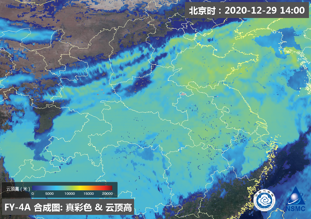 12月29日14:00時,上述地區的雲頂高度為5km至10km,黃淮地區的雲頂高度較高。圖/國家衞星氣象中心