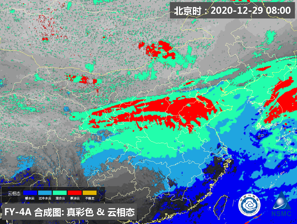 多時次雲相態產品顯示:厚冰云云系主要分佈在西北地區東部偏北、華北南部、黃淮東部和北部等地,混合雲主要分佈在西北地區東部偏南、黃淮西部、江漢和江淮北部,而過冷水雲的最南側已壓在江南南部一帶。從12月29日08:00到15:30時,上述地區雲相態中的厚冰雲、混合雲和過冷水雲逐漸東移,配合地面較強的降温變化和水汽供應,黃淮、江漢、江淮等地出現降雪天氣。圖/國家衞星氣象中心