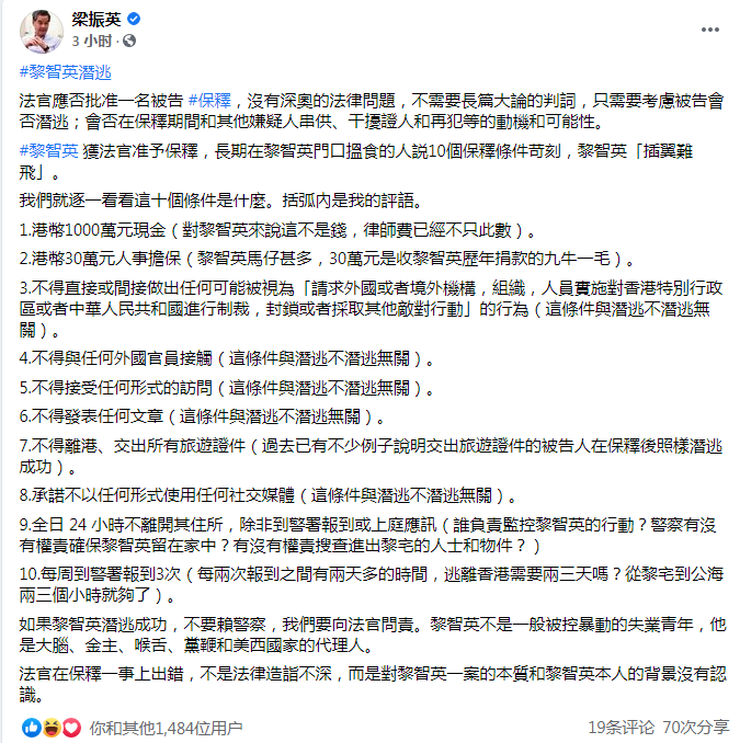 針對黎智英獲法官准予保釋後他的馬仔説10個保釋條件苛刻,黎智英“插翼難飛”,梁振英逐一反駁。