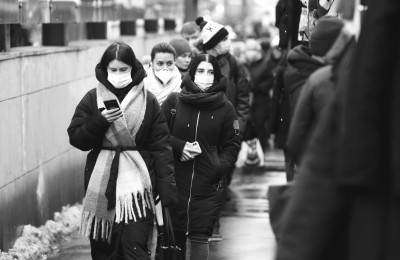 12月24日,在烏克蘭基輔,戴口罩的人們排隊候車。 新華社發