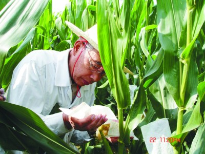玉米育種專家程相文在田間授粉。 光明圖片