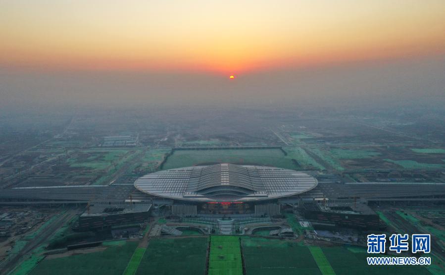 12月27日,開通當日晨光下的京雄城際鐵路雄安站(無人機照片)。新華社記者 牟宇 攝