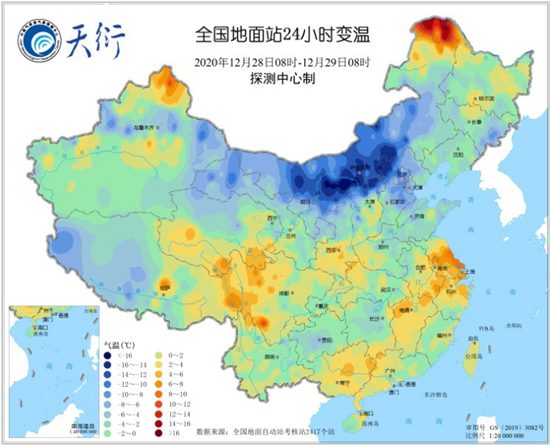 氣温方面,受到寒潮天氣影響,今晨08時,內蒙古、華北、黃淮等地出現明顯降温,其中內蒙古東勝降温達到18.1℃,氣温降至-25℃,為國家站降幅最大站點,北京佛爺頂降温16.7℃排在第二位。