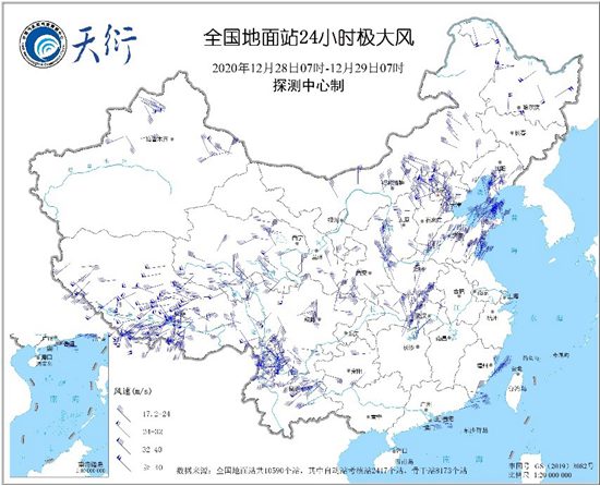 除了降雪,寒潮還帶來了大風天氣,截至今天07時,24小時極大風超過8級風(17.2m/s)的站有440個。從極大風分佈來看,冷空氣西段移速較快,東段相對較慢。