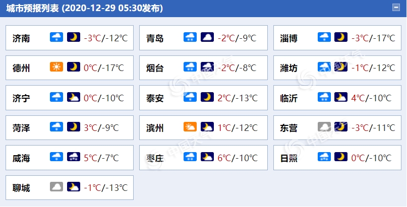 後天,半島地區天氣多雲轉晴,其他地區天氣晴間多雲。半島地區北風5~6級,陣風7~8級減弱到4~5級,其他地區北風轉南風3~4級。夜間最低氣温:魯中山區、魯東南和半島內陸地區-12℃左右,局部-14℃以下,半島沿海地區-5℃左右,其他地區-9℃左右。