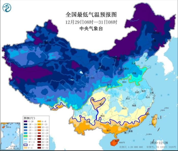 圖2 2020年12月29日08時至31日08時過程最低氣温預報