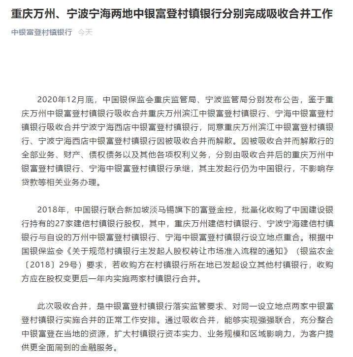 12月29日,中銀富登村鎮銀行稱,重慶萬州、寧波寧海兩地中銀富登村鎮銀行分別完成吸收合併工作。因被吸收合併而解散行的全部業務、財產、債權債務以及其他各項權利義務,分別由吸收合併後的重慶萬州中銀富登村鎮銀行、寧海中銀富登村鎮銀行承繼,其主發起行仍為中國銀行,不影響存貸款等相關業務辦理。
