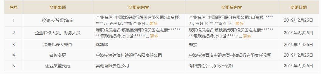 工商資料顯示,寧波寧海西店中銀富登村鎮銀行有限責任公司成立於2011年8月24日,前身為寧波寧海建信村鎮銀行有限責任公司。重慶萬州濱江中銀富登村鎮銀行有限責任公司成立於2012年5月22日,前身為重慶萬州建信村鎮銀行有限責任公司。