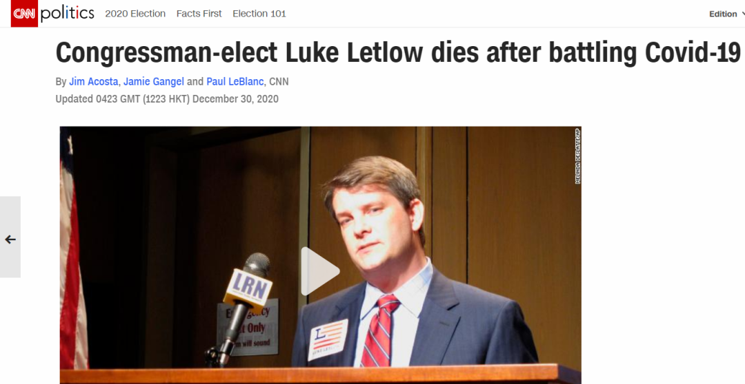據CNN等媒體報道,當地時間29日晚,路易斯安那州當選議員盧克·萊特洛因感染新冠肺炎去世,時年41歲。