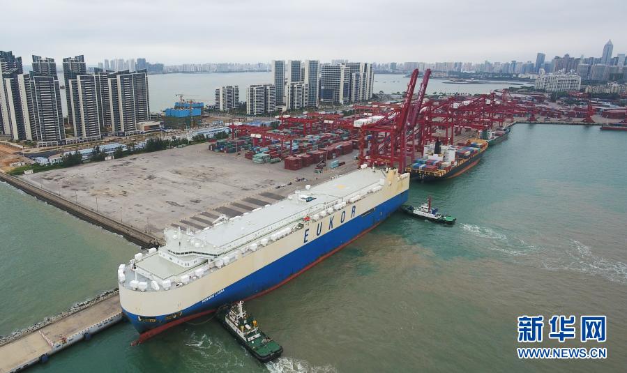 滾裝貨船“勞拉”輪駛入海口秀英港。這是海南自貿區政策實施以來的首艘汽車外貿船(2月16日攝,無人機照片)。新華社記者 楊冠宇 攝