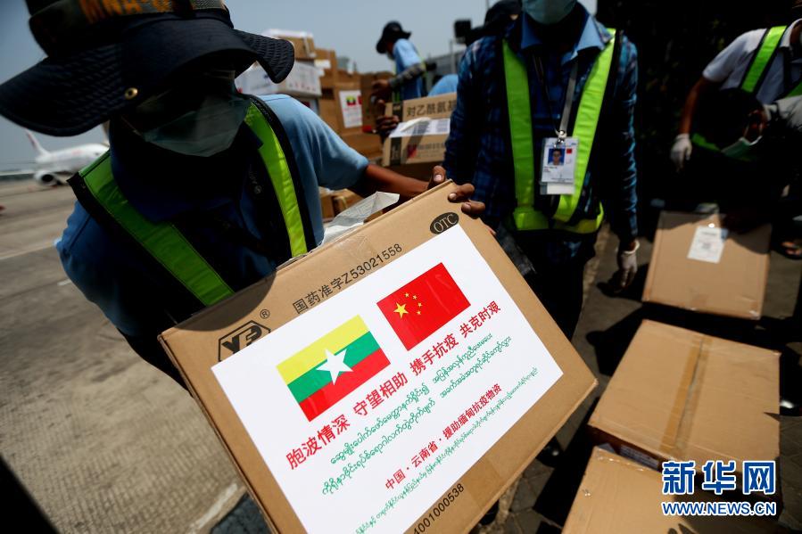 4月8日,在緬甸仰光國際機場,工作人員搬運中方捐贈的抗疫物資。中國政府派遣的抗疫醫療專家組當日抵達緬甸最大城市仰光,中方捐贈的一批防護用品、醫療設備和中成藥等抗疫物資也隨機抵達。新華社發(吳昂 攝)