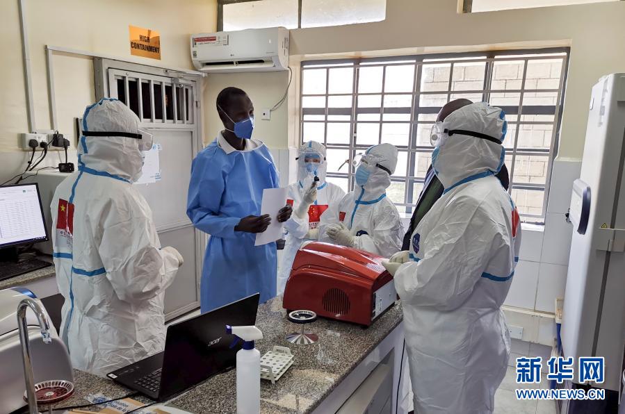 在南蘇丹首都朱巴的一處新冠病毒檢測機構,中國抗疫醫療專家組成員與南一線醫護人員交流(8月21日攝)。新華社發(中國駐南蘇丹大使館供圖)