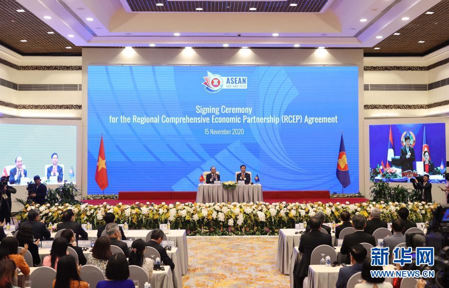 這是11月15日在越南首都河內拍攝的區域全面經濟夥伴關係協定(RCEP)簽署儀式現場。新華社/越通社