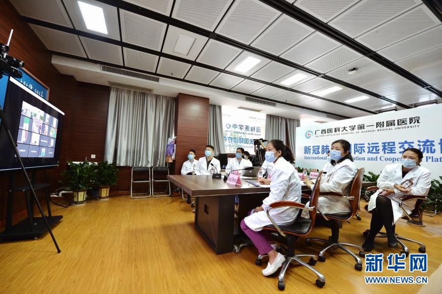 廣西醫科大學第一附屬醫院的專家通過視頻連線的方式,與柬埔寨多家醫院的醫務人員分享、交流新冠肺炎疫情防控經驗(4月20日攝)。新華社記者 崔博文 攝