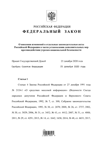 俄羅斯法律信息網站30日公佈了由總統普京簽署的“外國代理人”修訂法案。法案從公佈之日起生效。俄羅斯國家杜馬(議會下院)和聯邦委員會(議會上院)分別於本月23日和25日審議通過了“外國代理人”的修訂法案。