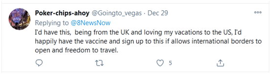 一位網友説,“我會去弄這個,我很想從英國來美國旅行,如果旅客可以自由出境的話,我樂意打疫苗並註冊這個疫苗護照。”↓