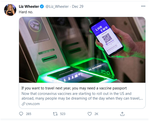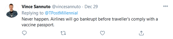 一位網友説,“這不可能發生。(因為)在旅行者們照做(去辦理)疫苗護照的時候,航空公司已經倒閉了。”↓