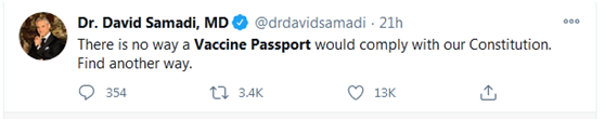 一名名叫戴維·薩馬迪的醫生説,“疫苗護照沒有遵守我們的憲法,再找找別的辦法吧。”↓
