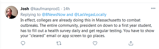還有網友説這已經不是什麼“新鮮事”了,他説,“實際上,在馬薩諸塞州的大學裏,已經在做這類抗擊疫情的事情了。整個(大學)社區、以及校長要求大一新生,都必須要填寫日健康調查並做常規檢測。外出時,你必須在郵件或手機上提供‘正常’的健康狀態”↓